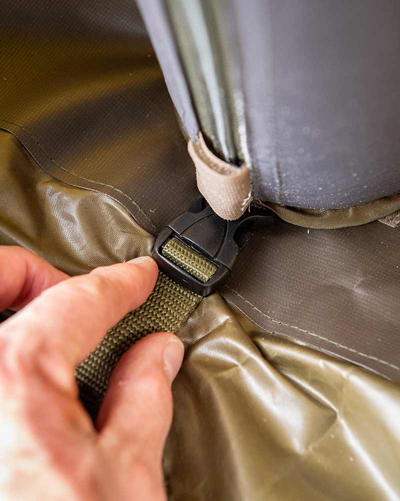 - Die Rückwand mit Reißverschluss ermöglicht den Einstieg von hinten oder den Ausbau des Biwaks/Schirms.