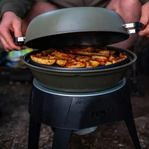Markenkochstation Fox, ideal für Ihre Carpfishing-Sessions. Mit Kochutensilien für die Zubereitung von Speisen für unterwegs.