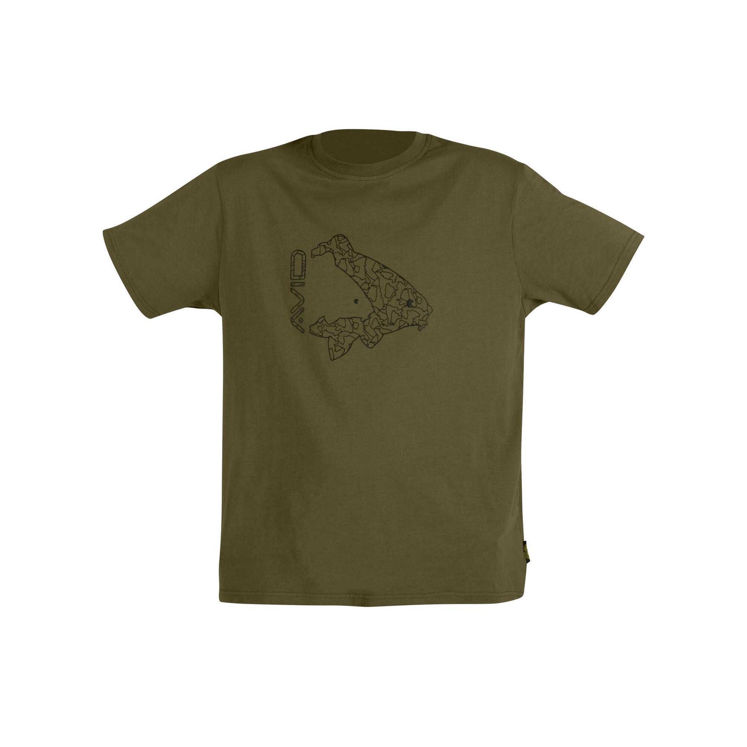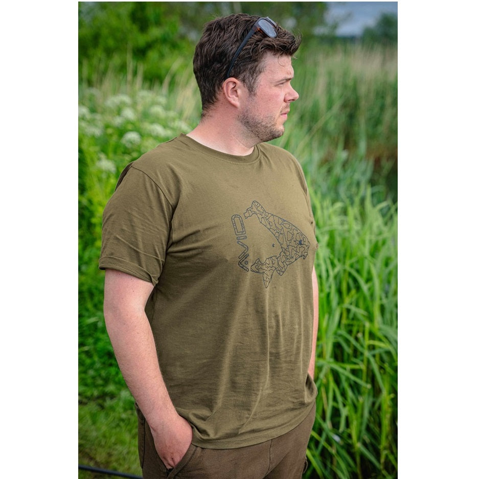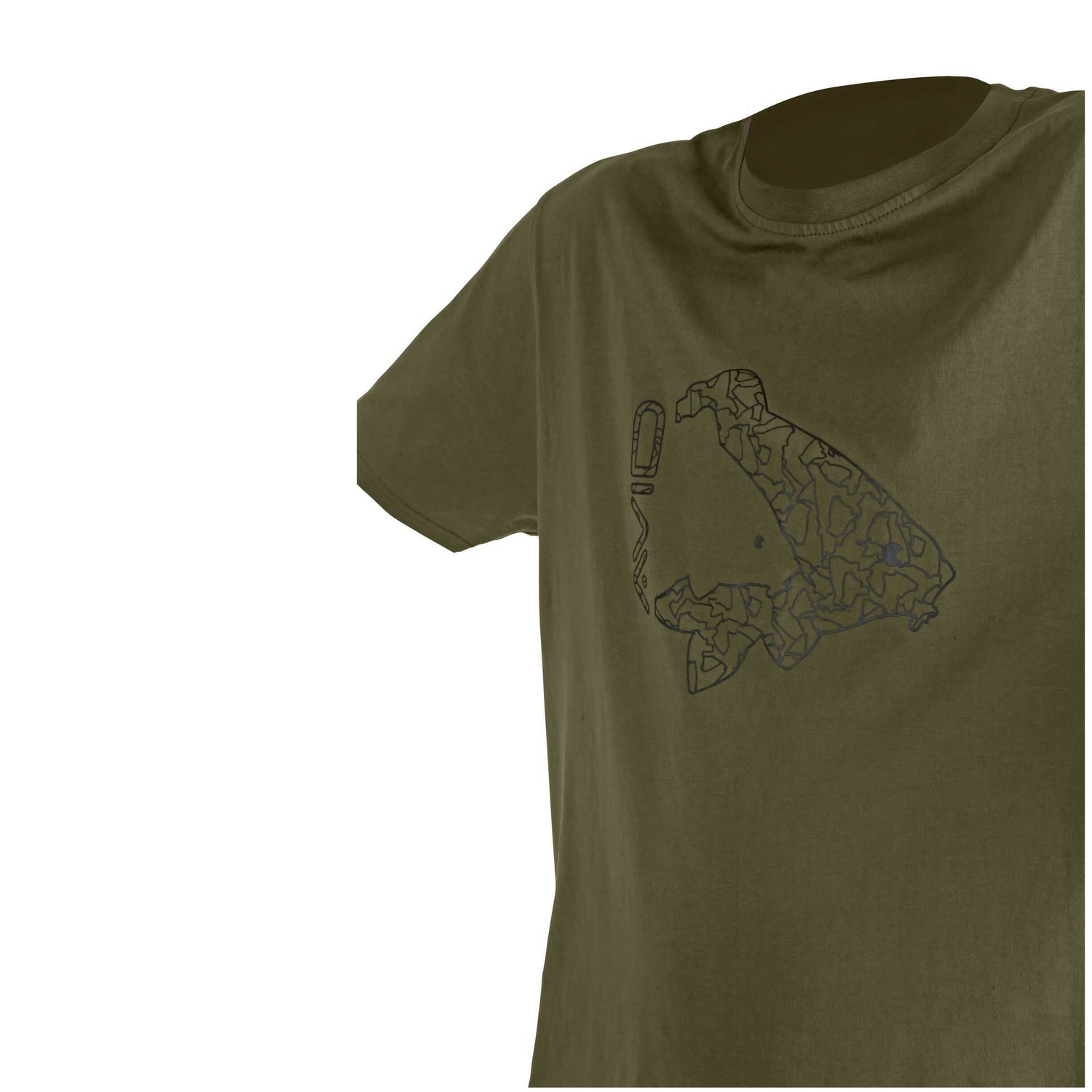 Marken-T-Shirt Avid Carp Modell Ikone in Farbe Khakimit dem Logo der Marke, perfekt für Ihre Carpfishing-Sessions.