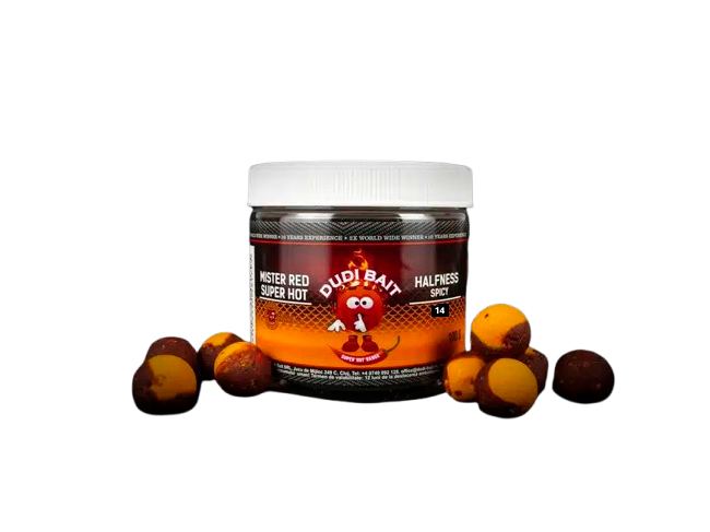 Die Halbheit der Marke Dudi Bait von 14 Millimetern aromatisiert mit Mister Rot Super Hot aromatisiert mit würzigem Fisch, besonders für das Karpfenfischen.