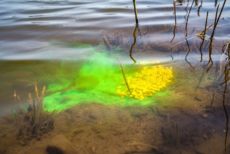 Fläschchen mit Flüssigkeit fluoreszierend 150 Milliliter Creme der Marke Pro Elite Baits Geschmack Banane-Erdbeere unter Farbe grün, besonders für das Karpfenfischen.