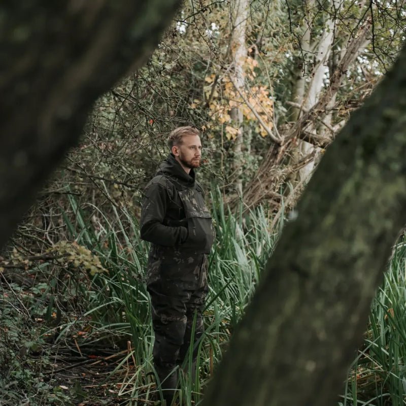 Wasserdichtes Lätzchen und Korsett Nash Modell ZT Helluva Entwurf Tarnung unter Farbe Tarnungspeziell für Carpfishing. Stoff Design stark wasserabweisend so dass Sie sicher das Ufer betreten können, um Fische zu fangen, Angeln und Köder auszulegen, Fotos zu machen und die Fische zurückzugeben.