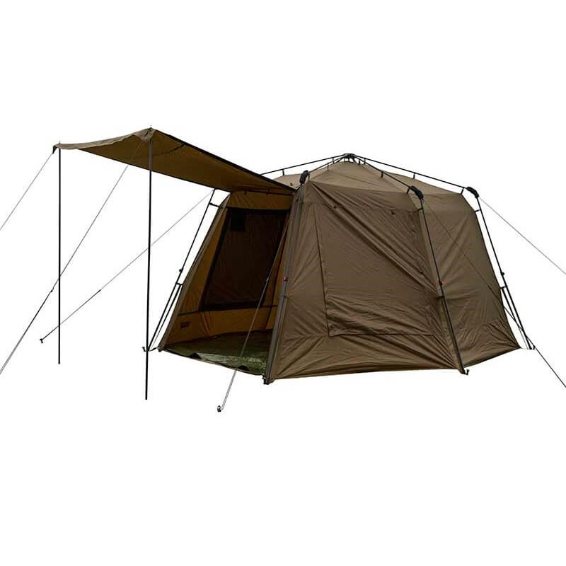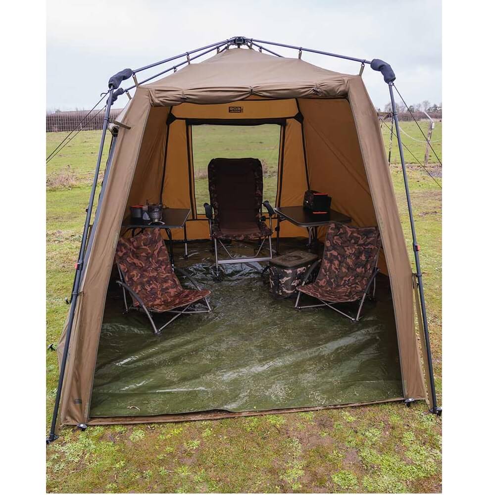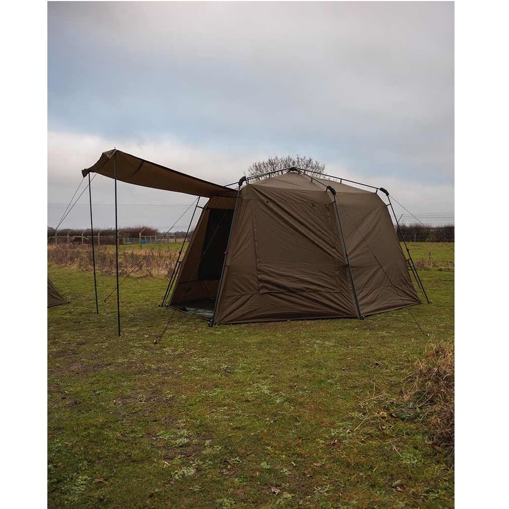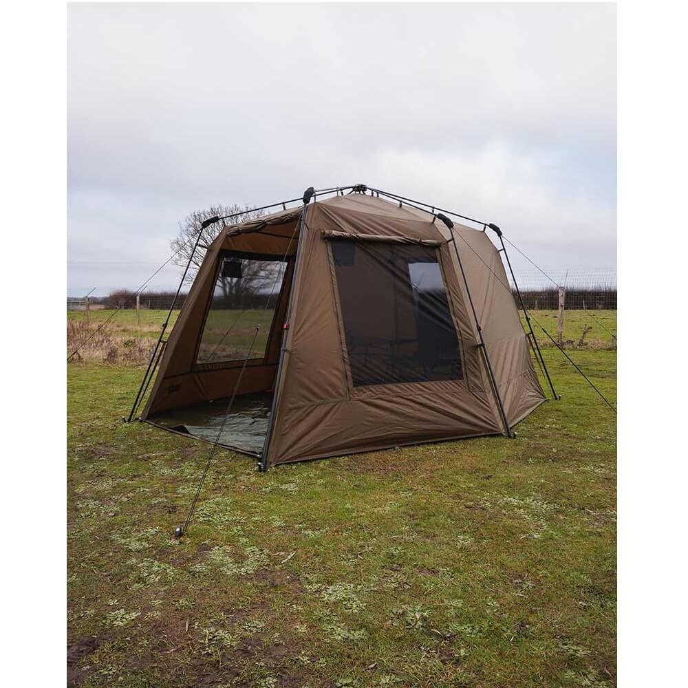 Branded Shelter Fox Modell EOS Social Shelter unter Farbe khaki, speziell für Carpfishing.