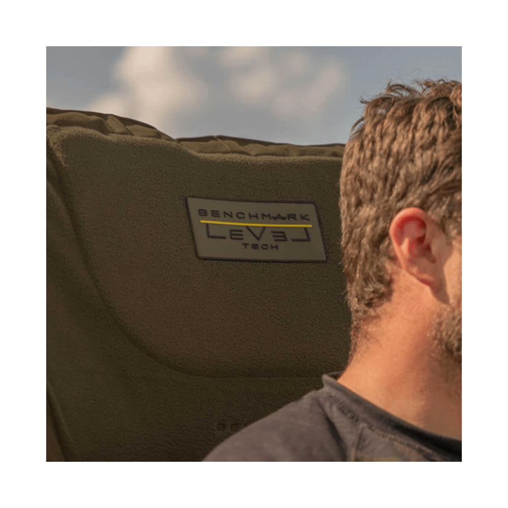 Liegesessel der Marke Avid Carp Modell Benchmark Leveltech HI-Back in Farbe grünspeziell für das Karpfenfischen.