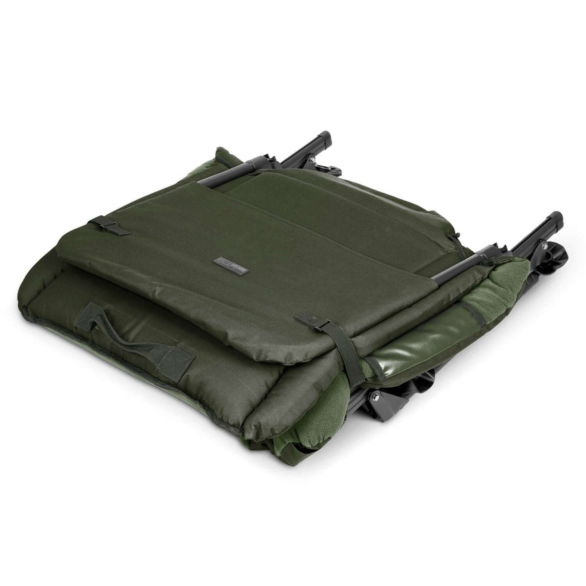 Stuhl der Marke Sonik, Modell Bank-Tek Bequem, unter Farbe grün, besonders für das Karpfenfischen.