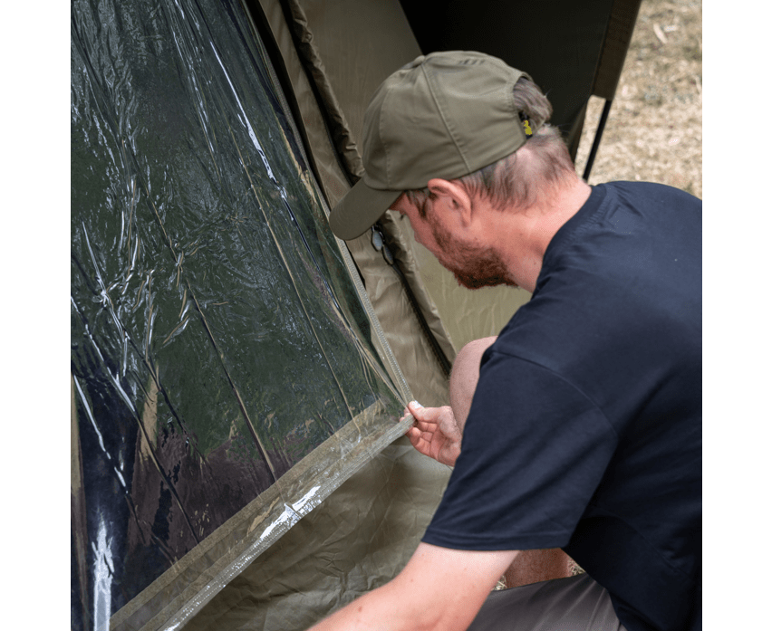 - Für ein offenes Biwak lässt sich die Vorderseite komplett aufrollen, während die Zwei-Wege-Briefkastentür über ein integriertes Netz- und PVC-Fenster verfügt