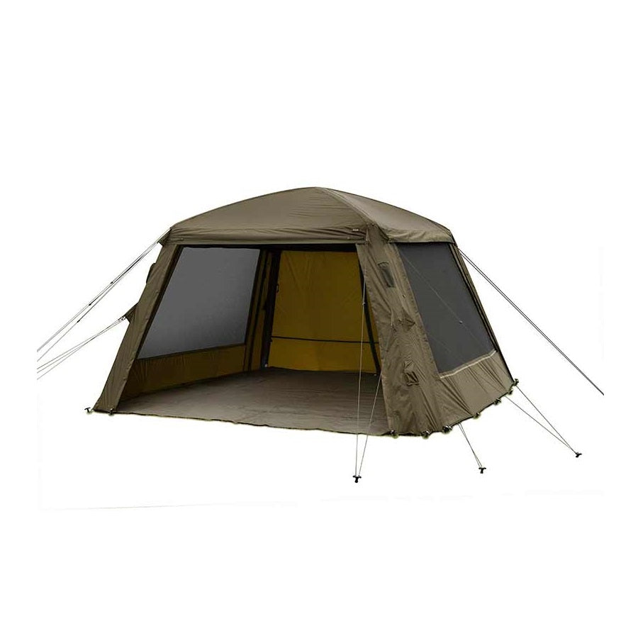 Sozialer Schutzraum der Marke Fox Modell Air Frame 3x3 unter Farbe khaki mit einer vollständig aufblasbaren Struktur, die die erste soziale Unterkunft dieser Art ist., speziell für Carpfishing.